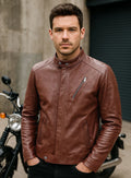 Step up your look with this Handcrafted Tan Brown Cow Leather Biker Jacket, designed for men who value style, comfort, and lasting quality. Made from 100% genuine cowhide leather, it features a clean, modern biker design with a stand collar and premium metal zippers for a refined yet rugged appeal.